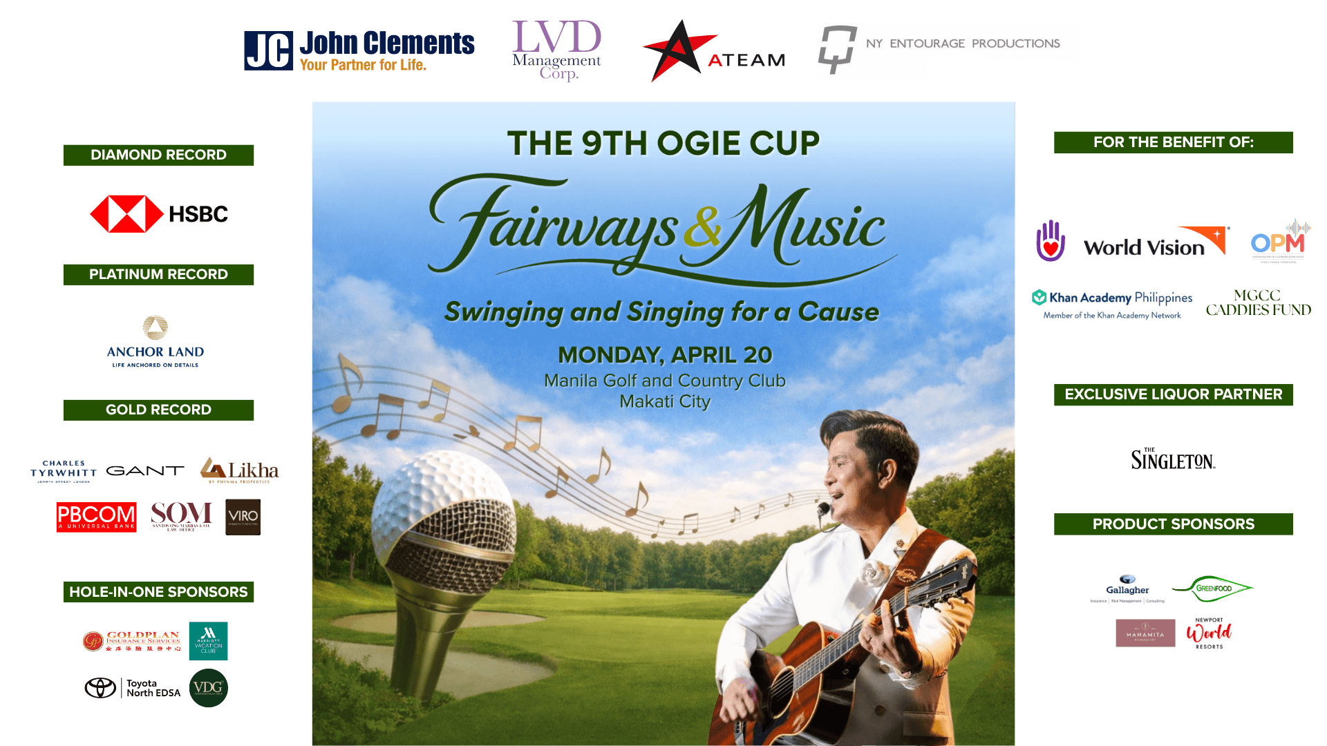 On April 20, 2026, the 9th Ogie Cup united entertainment icons and corporate leaders at Manila Golf & Country Club for a day of celebrity golf for a cause. Organized by Ogie Alcasid in partnership with John Clements Consultants and LVD Management, the tournament raised over ₱15 million along with 10 pledged surgeries. The mulligan initiative alone generated ₱100,000 for the Manila Golf Caddies Fund. The day concluded with an unforgettable performance by Ogie Alcasid, sealing a celebration of generosity, community, and music.